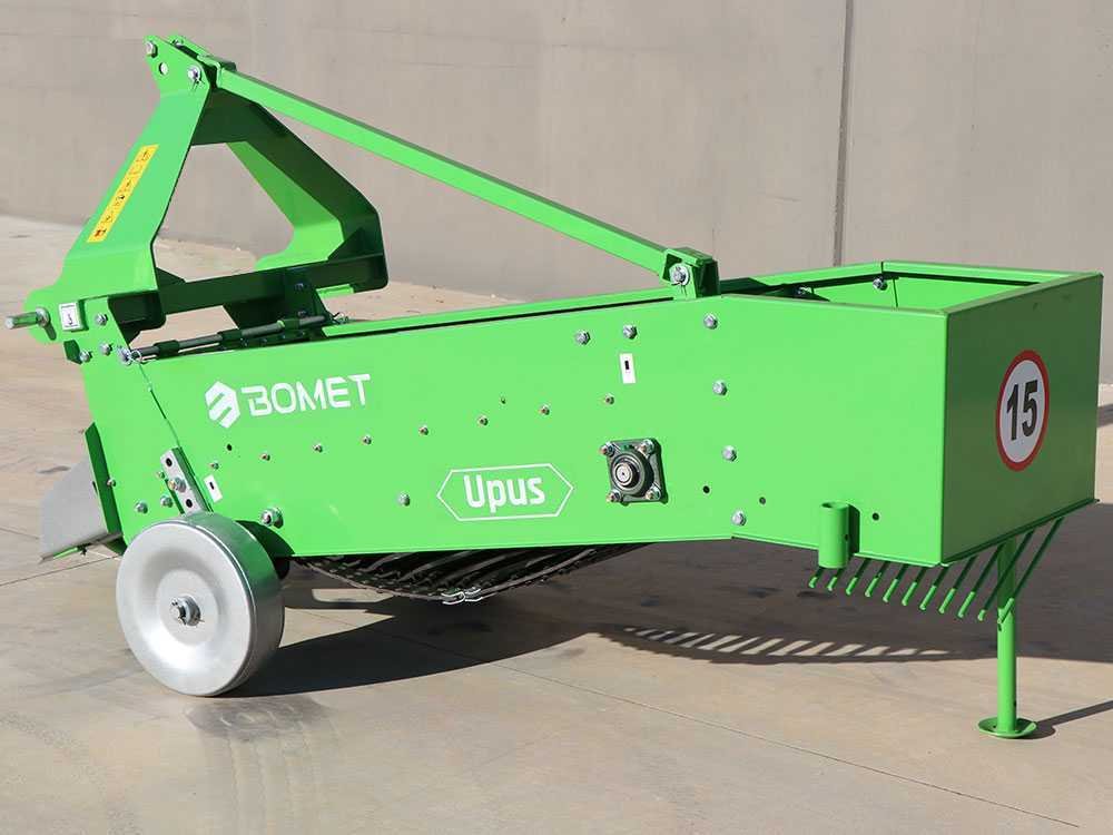 A arrancadora de batatas Bomet UPUS (fileira simples) é uma máquina equipada com um sistema de suspensão de três pontos e acionada por um eixo cardã conectado à tomada de força do trator. O monte de terra com as batatas é levantado por um arado e direcionado para a grelha.