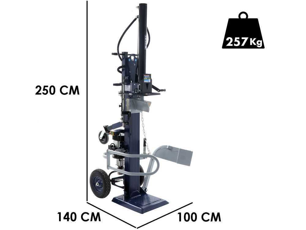 A cunha, com força de 18 toneladas, consegue fender toras de até 110 cm de comprimento, com diâmetro entre 8 cm e 30 cm.