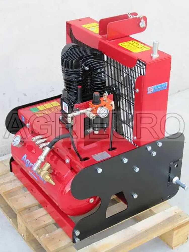 Esta cabeça bicilíndrica com cilindro em ferro fundido garante longa vida útil. Produção elevada de ar: 540 L/min com apenas cerca de 1200 rpm do motor do trator, garantindo o funcionamento de 2 pentes vibratórios, 5 tesouras pneumáticas e 1 serra pneumática.