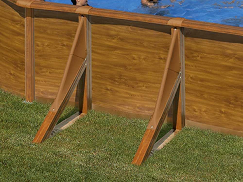 A piscina Gre Pacific Oval 610 x 375 cm possui estrutura reforçada com postes laterais para maior estabilidade e, para maior segurança, proteções por injeção são incluídas nos pontos de união entre os perfis horizontais, garantindo conexões seguras.