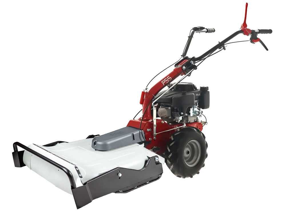 A roçadora térmica P55 é uma máquina automotriz com motor a combustão, equipada com rodas pneumáticas perfiladas e tração, conectadas a uma transmissão com parafuso sem-fim em banho de óleo.