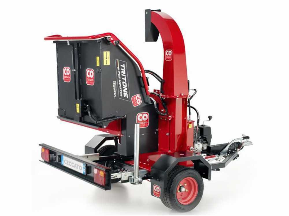 O triturador de vegetais com chassi sobre rodas da Ceccato, modelo Tritone Super Monster, com motor HONDA GX690, é um triturador profissional a motor térmico, adequado para triturar grandes quantidades de resíduos verdes. Este modelo, topo de gama, está equipado com um rolo de alimentação automática da folhagem, acionado por bomba oleodinâmica, e uma tremonha de dimensões excecionais que facilita muito as operações de enchimento.